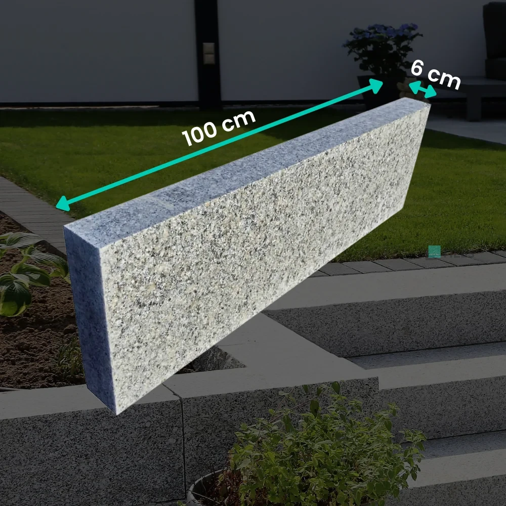 Medžiaga Granitas Spalva Pilka Formatas cm 100x20 Storis cm 6 Paviršiaus tipas Liepsna Kilmės šalis Kinija Importuotojas Tiles Sp. z o.o.