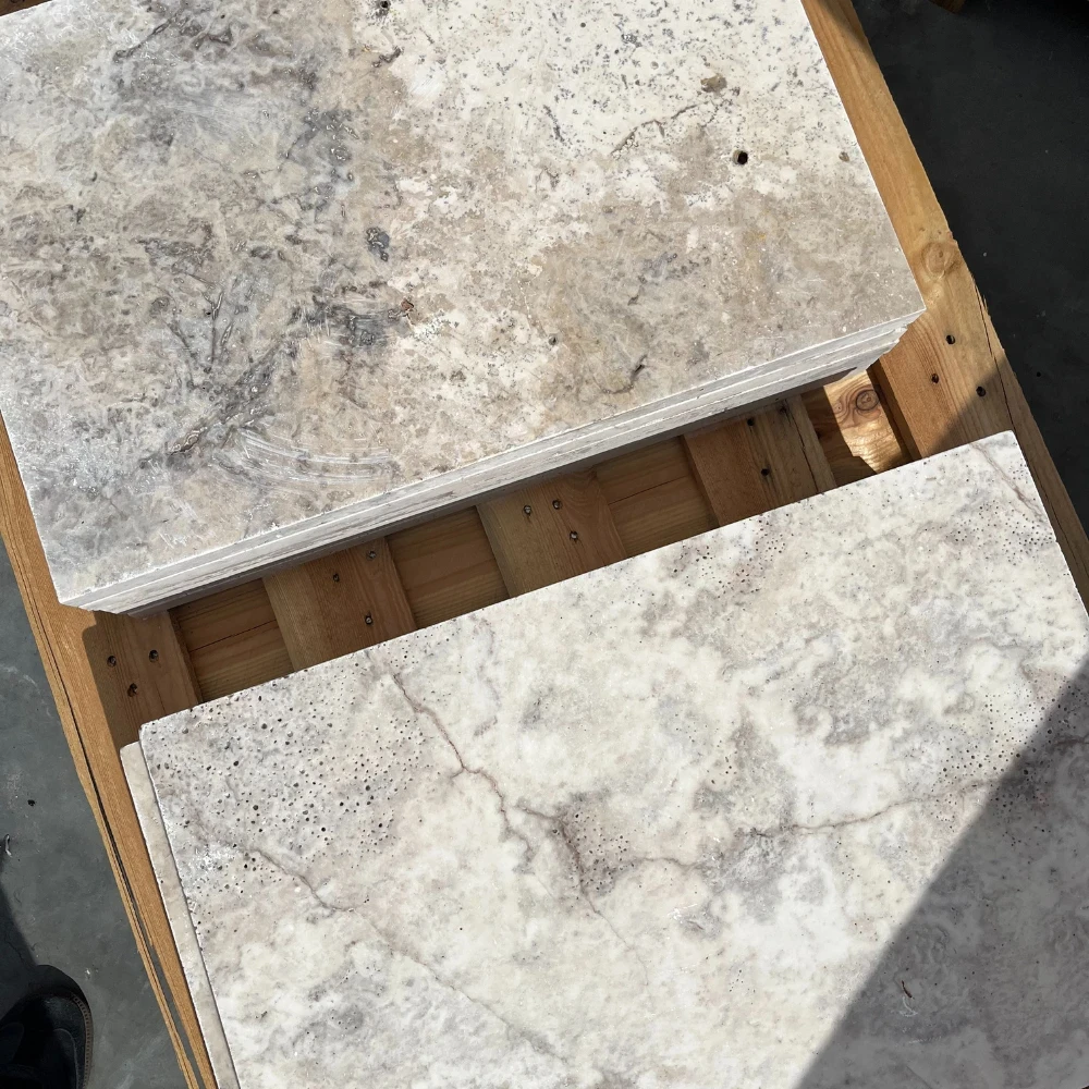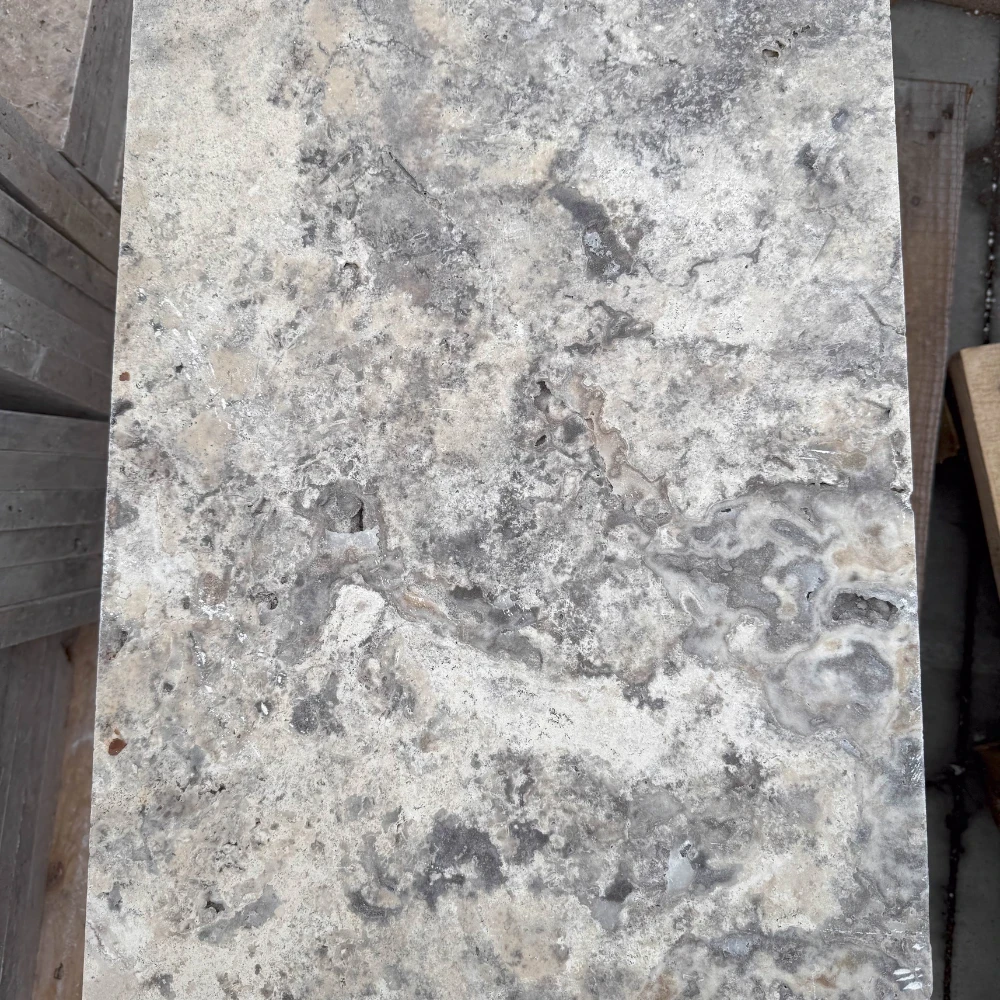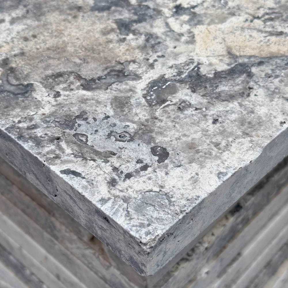 Sidabrinis latte travertinas yra elegantiškas natūralus akmuo, kuris stovi šiltos, smėlio ir sidabrinės spalvos bei unikali, subtiliai porėta struktūra, būdinga travertinui. 61x61 cm matmenų ir 3 cm storio plytelės buvo apverstos, todėl jų kraštai ir paviršius įgauna šiek tiek apvalias formas, suteikiančias joms unikalų, senovinį charakterį.