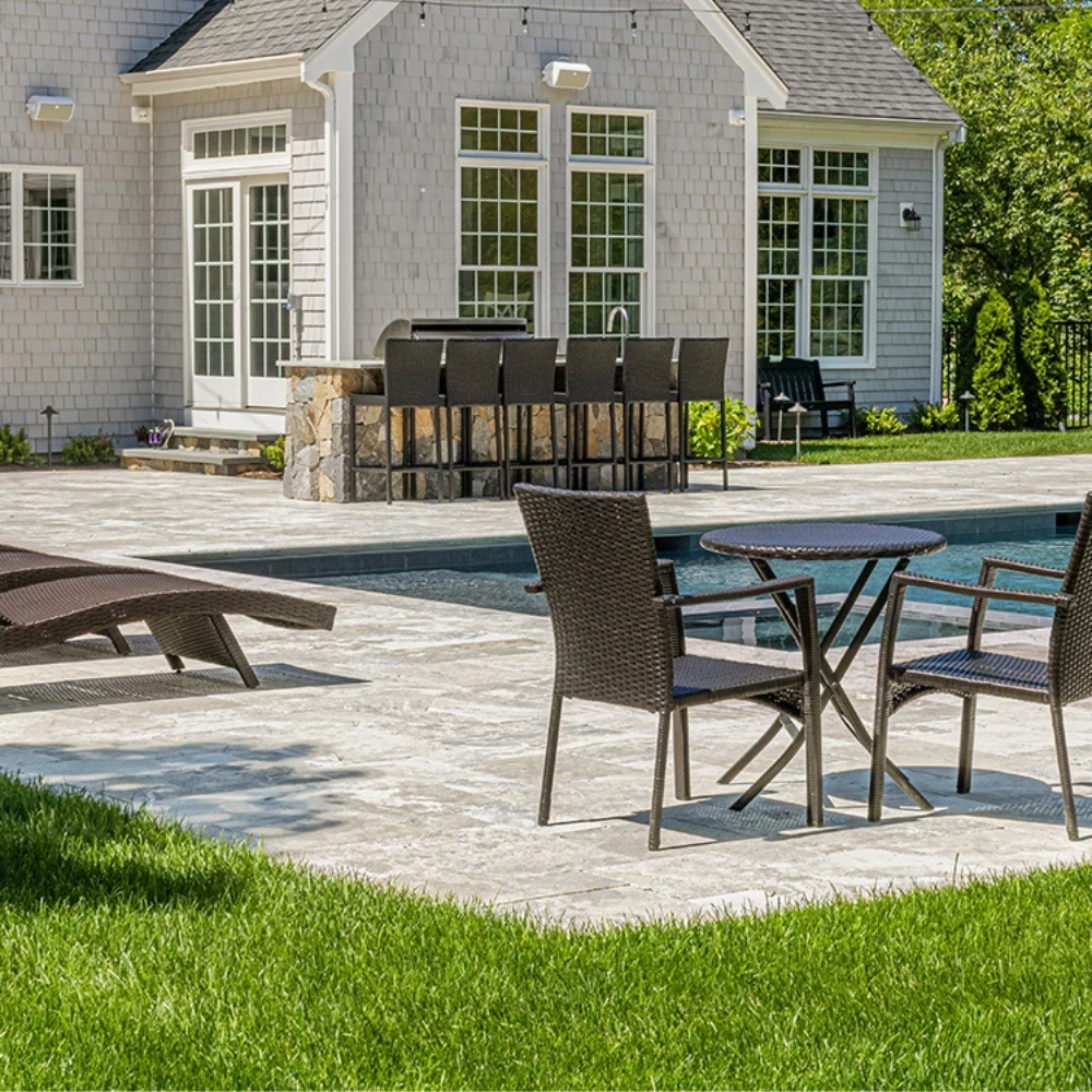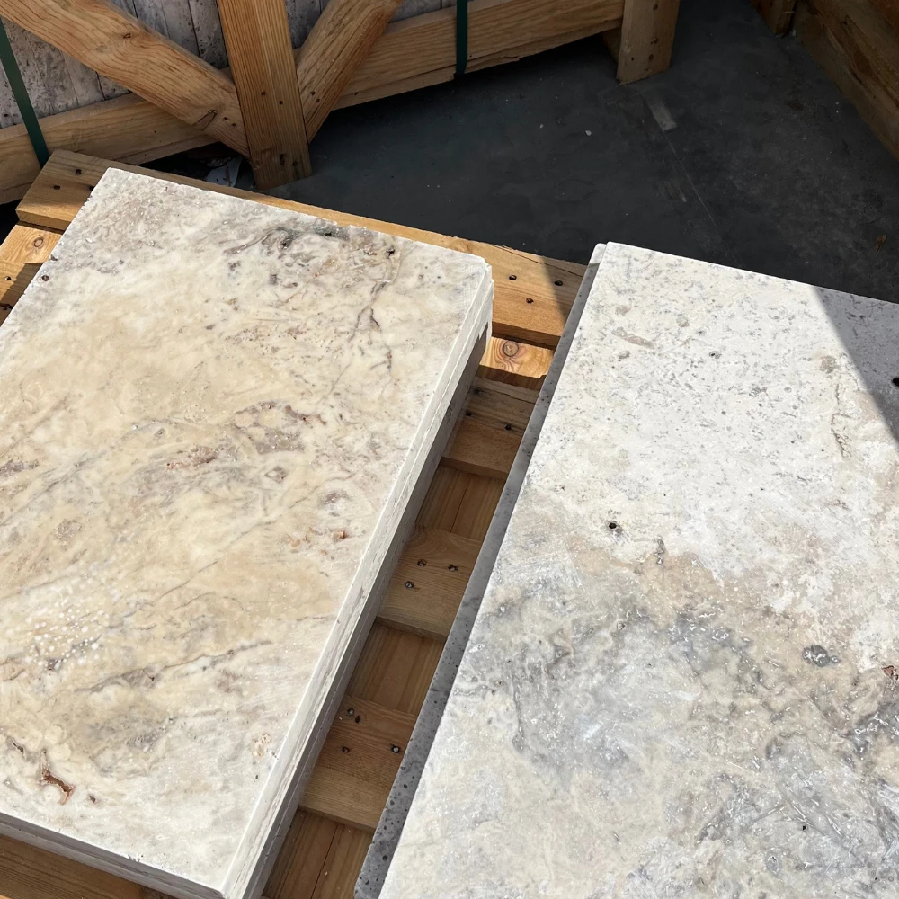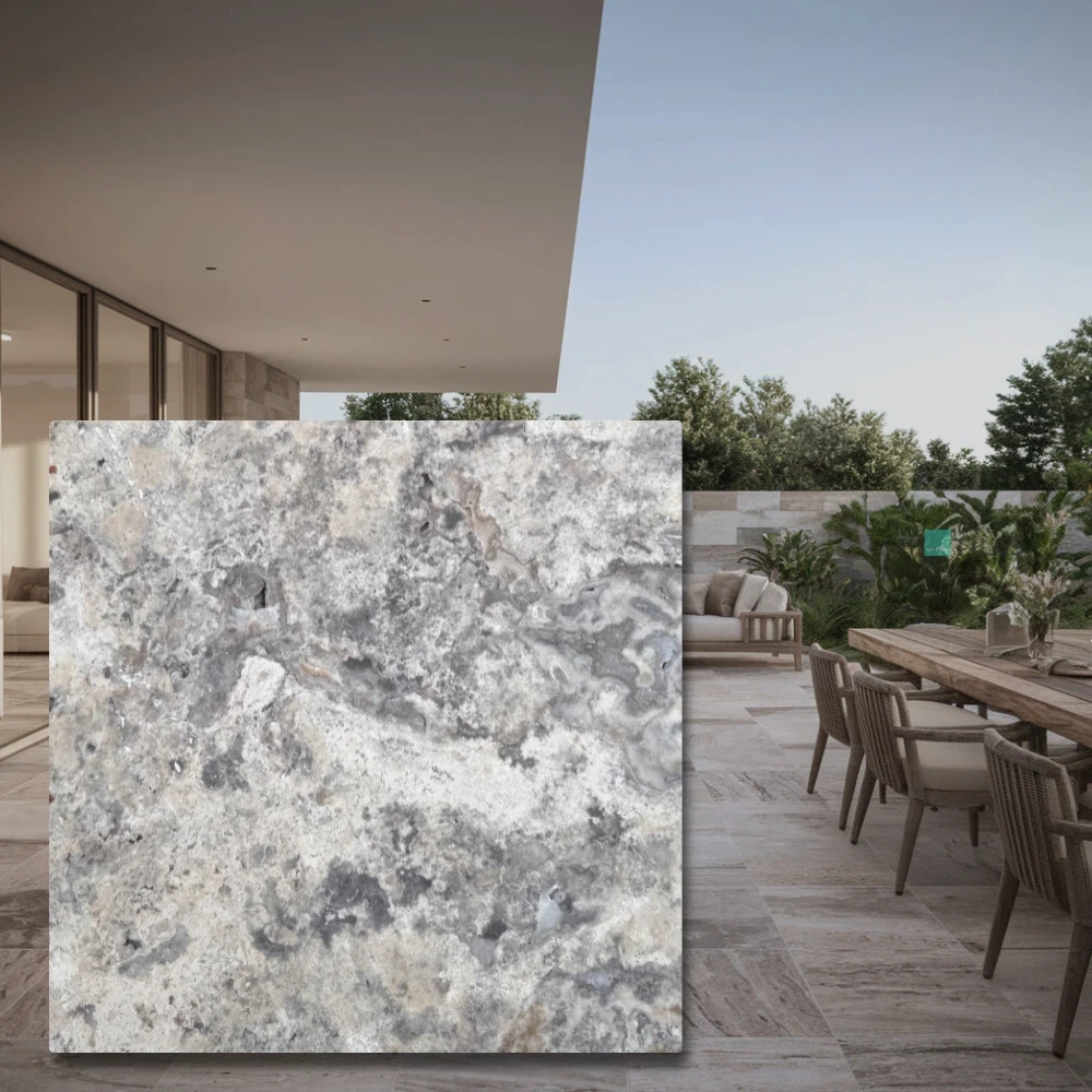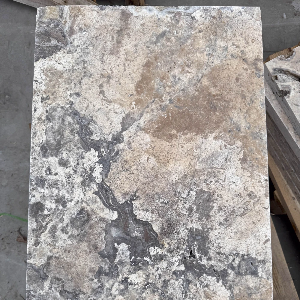 Sidabrinis latte travertinas yra elegantiškas natūralus akmuo, kuris stovi šiltos, smėlio ir sidabrinės spalvos bei unikali, subtiliai porėta struktūra, būdinga travertinui. 61x61 cm matmenų ir 3 cm storio plytelės buvo apverstos, todėl jų kraštai ir paviršius įgauna šiek tiek apvalias formas, suteikiančias joms unikalų, senovinį charakterį.